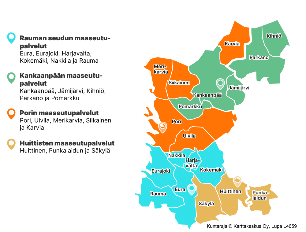 Eura, Eurajoki, Harjavalta, Kokemäki, Nakkila ja Rauma muodostavat maaseutuhallinnon yhteistoiminta-alueen, jonka palveluista vastaa Euran kunta.
