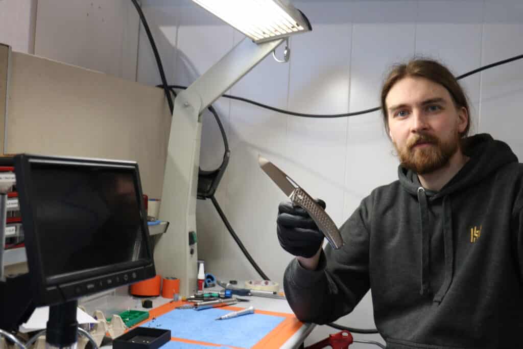 Arbetstagaren gör samma som kärnduon: i första hand högklassiga fällknivar.