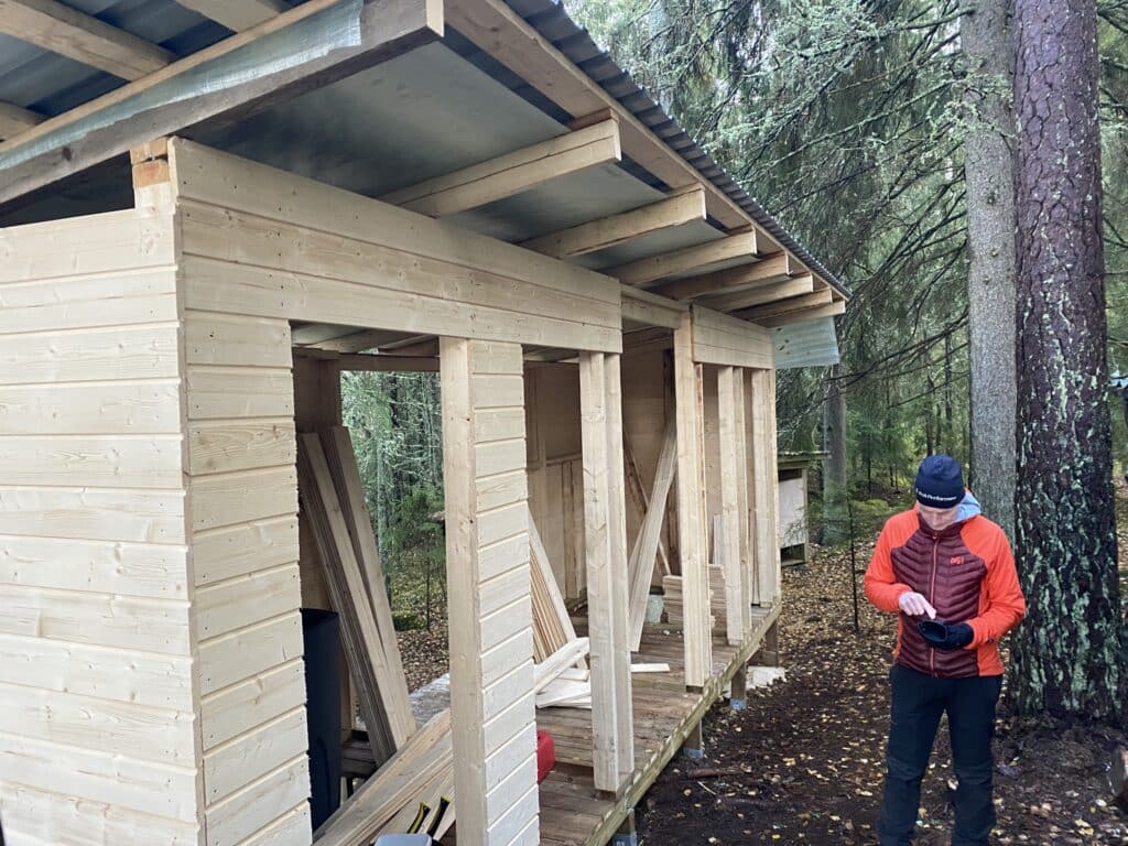 — Kämppä saatiin valmiiksi 2019 ja se on rakennettu täältä saaresta kaadetuista parista kymmenestä puusta. Ne on myös vuoltu paikan päällä pääosin talkoilla. Ammattiosaamista hirsikämpän rakennushankkeeseen saatiin Joni Koivusalolta, hän etsi hirsille vastaparit ja teki niihin mm. nurkkasalvokset, Valli kertoo.