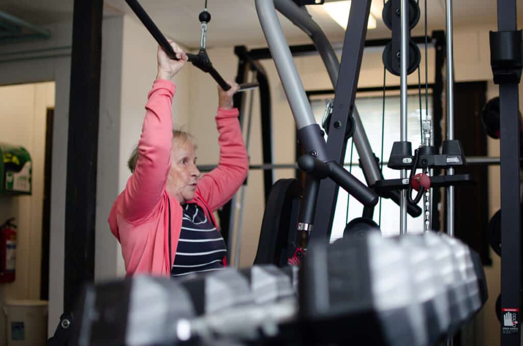 Kyläseuran puheenjohtaja Lea Aikio testaa kuntosalilaitteita.