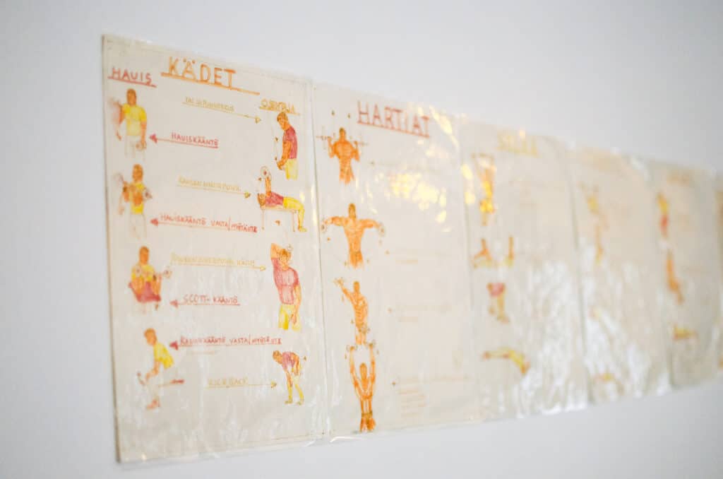Kuntosalin vanhoja ohjeita on säilytetty koristamaan uuden kuntosalin seinää.