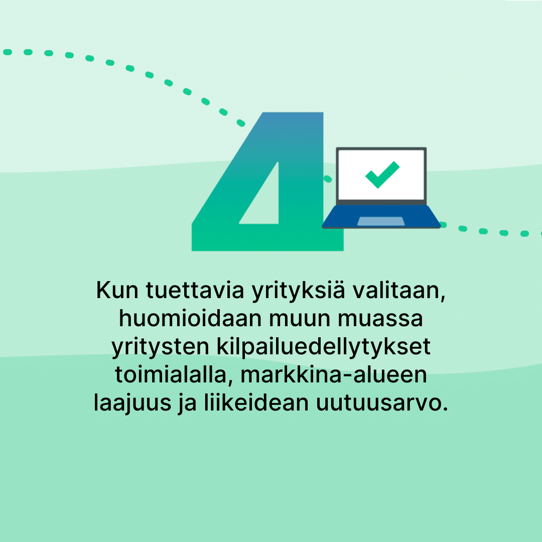 4. Kun tuettavia yrityksiä valitaan, huomioidaan muun muassa yritysten kilpailuedellytykset toimialalla, markkina-alueen laajuus ja liikeidean uutuusarvo