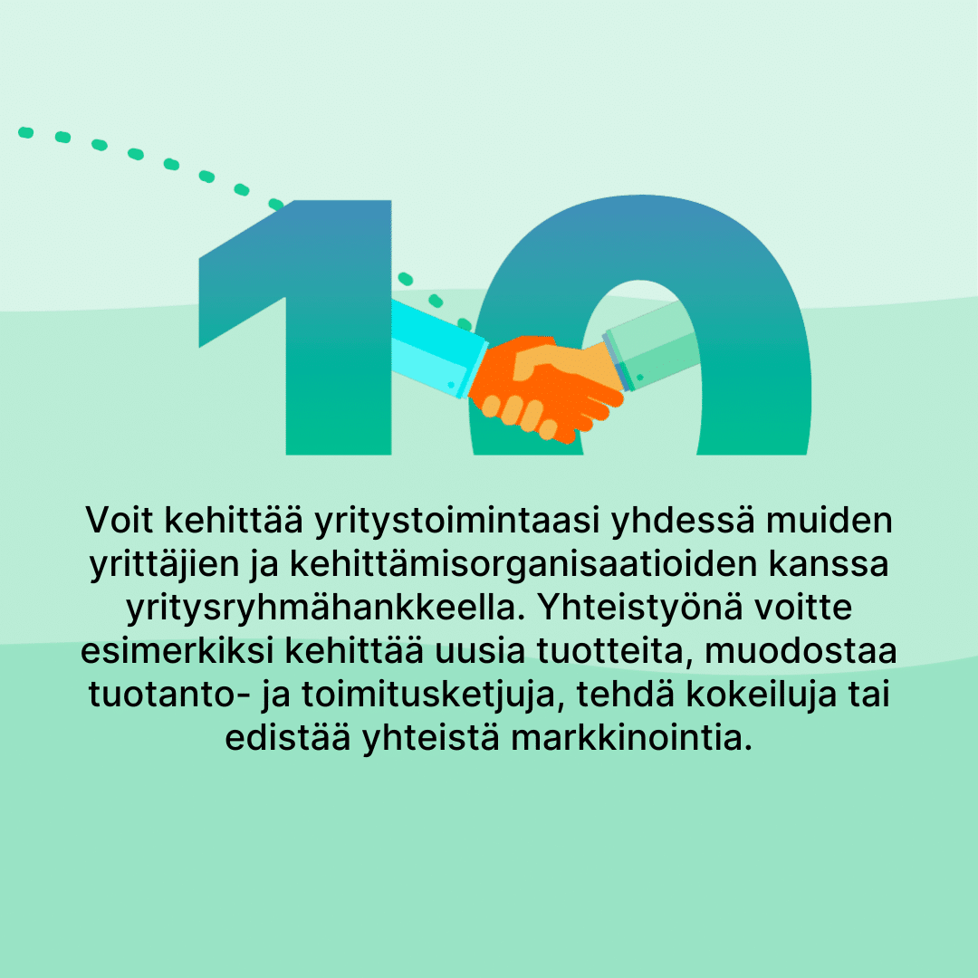 10. Voit kehittää yritystoimintaasi yhdessä muiden yrittäjien ja kehittämisorganisaatioiden kanssa yritysryhmähankkeella. Yhteistyönä voitte esimerkiksi kehittää uusia tuotteita, muodostaa tuotanto- ja toimitusketjuja, tehdä kokeiluja tai edistää yhteistä markkinointia