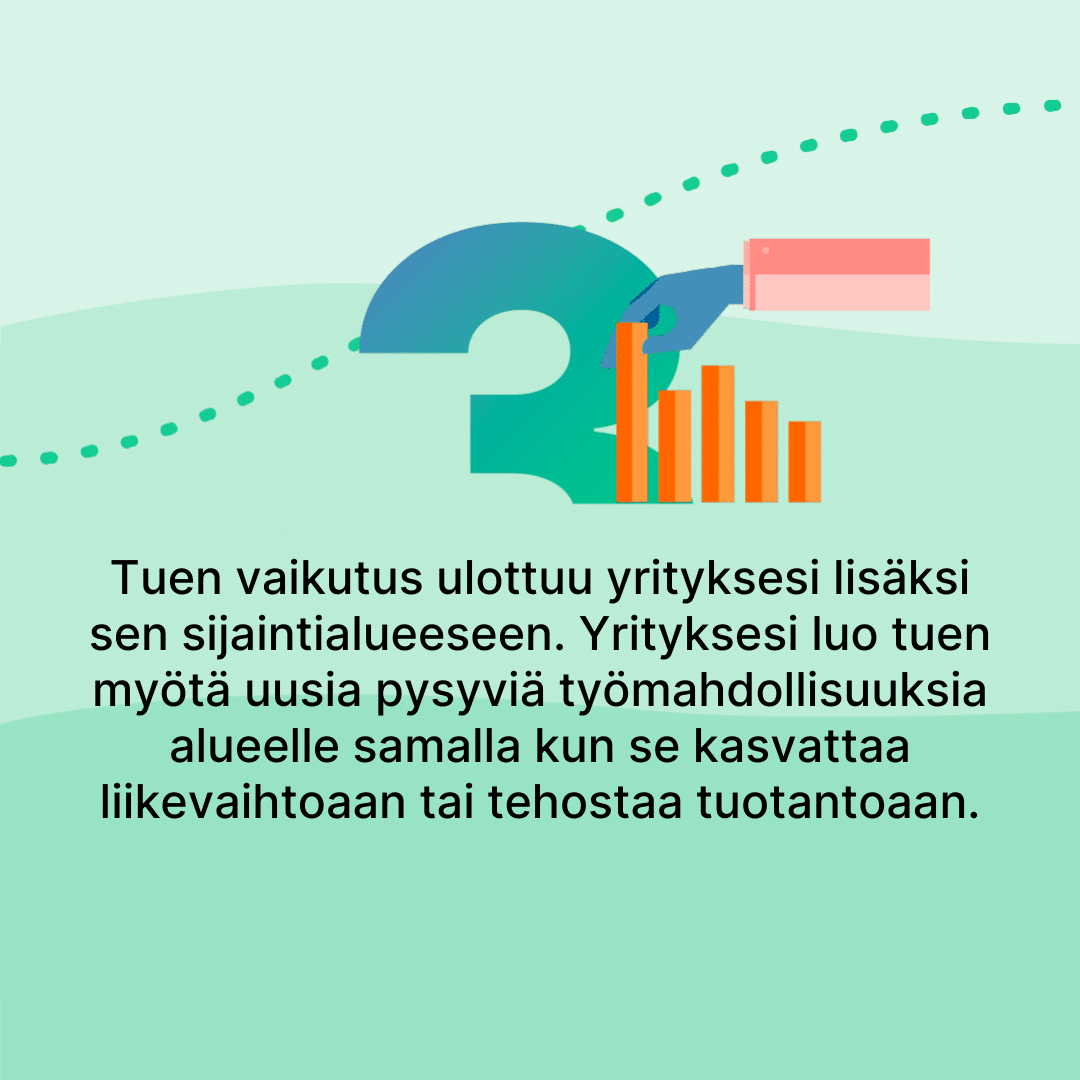 3. Tuella on merkittäviä vaikutuksia sekä yritykseesi että sen sijaintialueelle. Yrityksesi luo tuen myötä uusia pysyviä työmahdollisuuksia alueelle samalla kun se kasvattaa liikevaihtoaan tai tehostaa tuotantoaan.