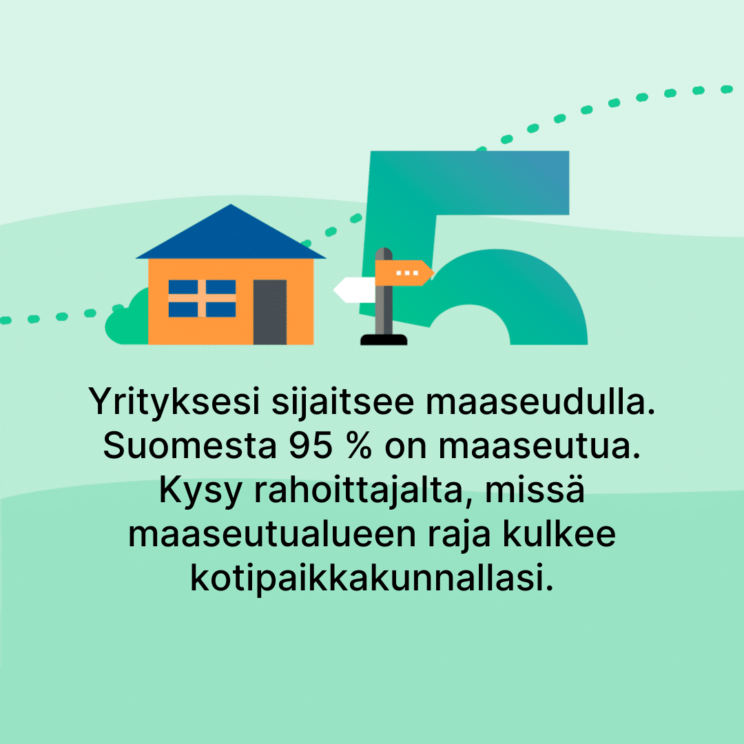 5. Yrityksesi sijaitsee maaseudulla. Suomesta 95 % on maaseutua. Kysy rahoittajalta, missä maaseutualueen raja kulkee kotipaikkakunnallasi.