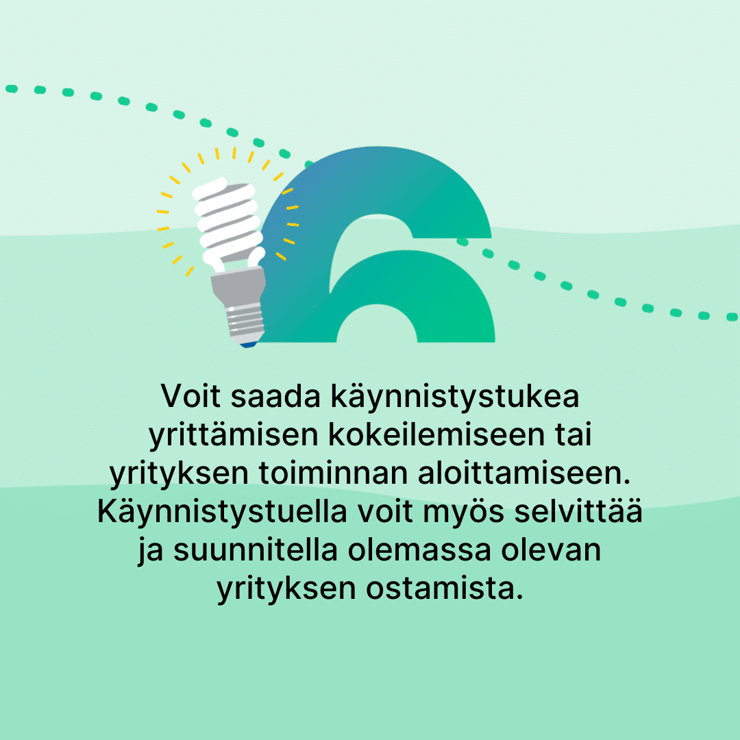 6. Voit saada käynnistystukea yrittämisen kokeilemiseen tai yrityksen toiminnan aloittamiseen. Käynnistystuella voit myös selvittää ja suunnitella olemassa olevan yrityksen ostamista.