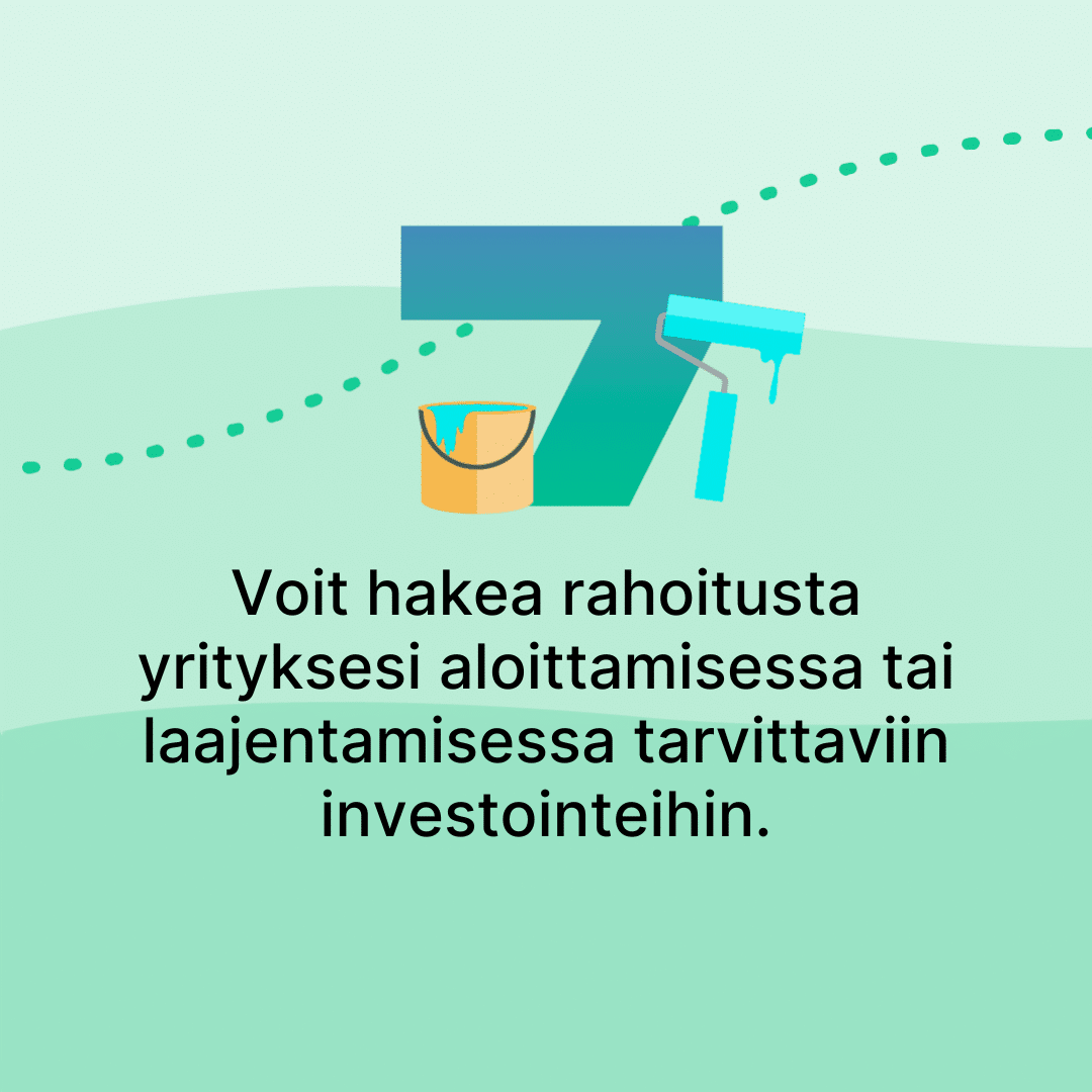 7. Voit hakea rahoitusta yrityksesi aloittamisessa tai laajentamisessa tarvittaviin investointeihin.