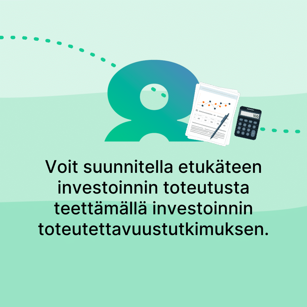 8. Voit suunnitella etukäteen investoinnin toteutusta teettämällä investoinnin toteutettavuustutkimuksen. Voit saada yrityksen kehittämistukea investoinnin toteutettavuustutkimuksen tekemiseen,