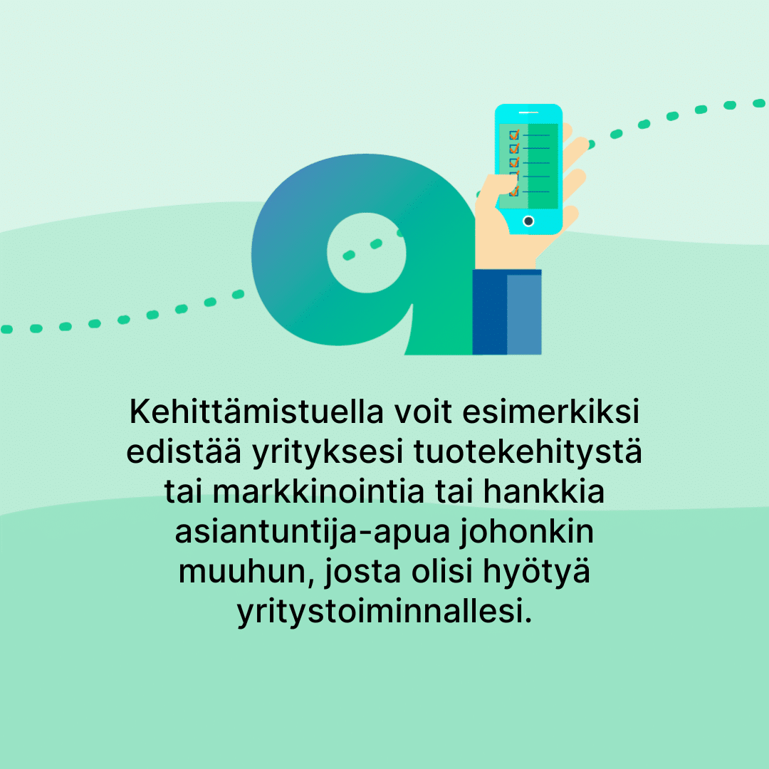 9. Kehittämistuella voit esimerkiksi edistää yrityksesi tuotekehitystä tai markkinointia tai hankkia asiantuntija-apua johonkin muuhun, josta olisi hyötyä yritystoiminnallesi. Lisätietoa kehittämistuesta